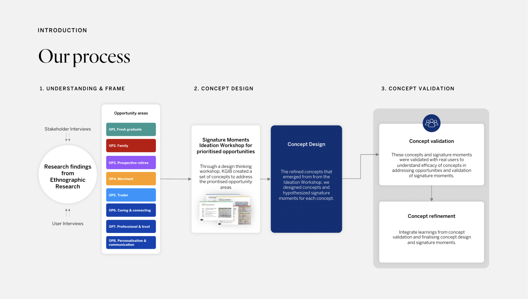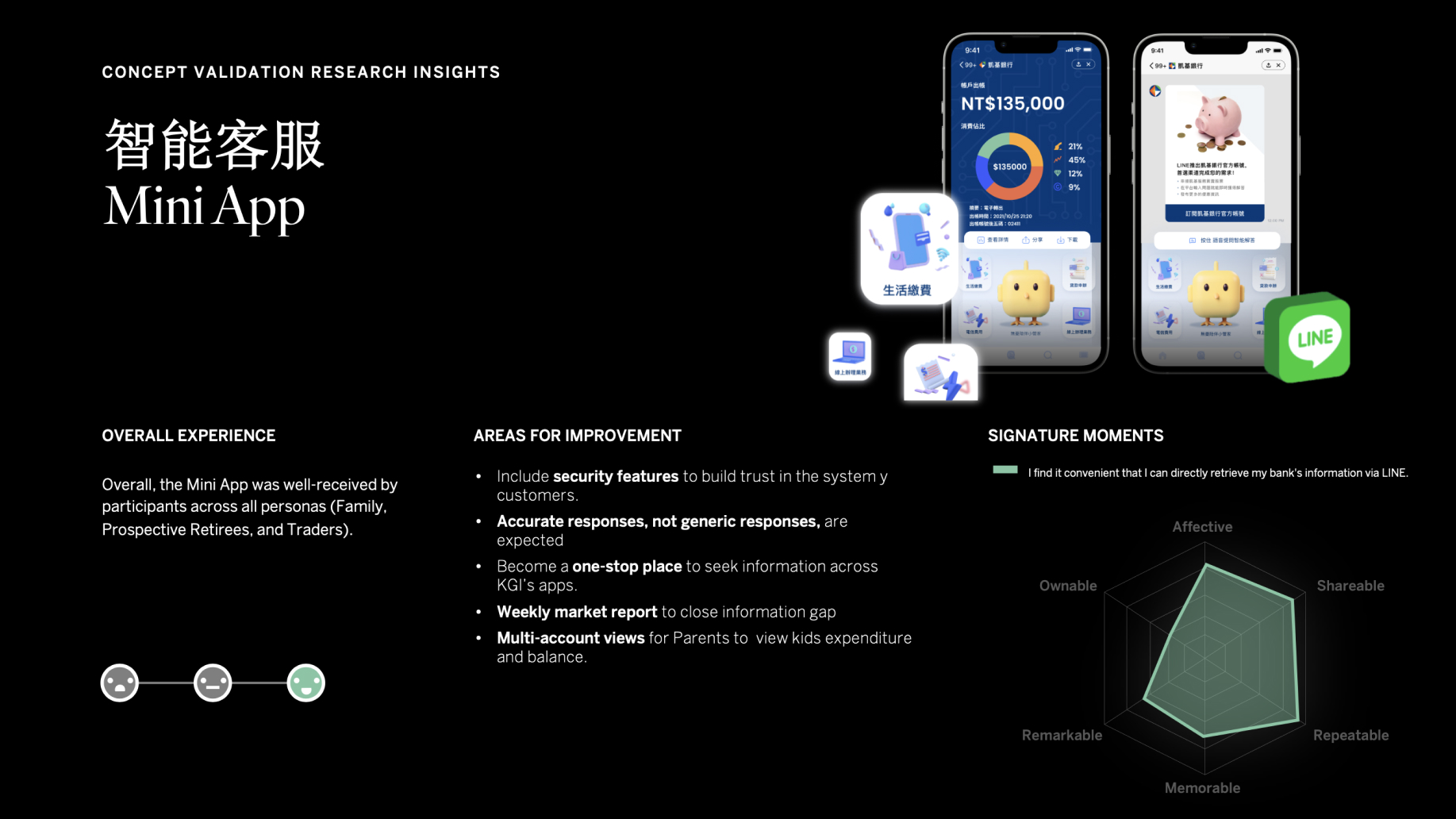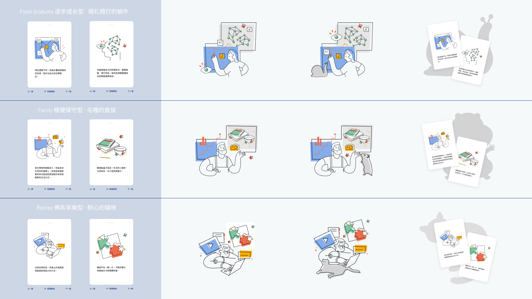 Start from the Ethnographic Research. By conducting 27 user interviews, 6 expert interviews, 4 competitor researches and 47 case studies, frog summarized the findings into 8 key insights. After synthesis, the 5 convergent personas are fresh graduate, family, prospective retiree, merchant and trader.