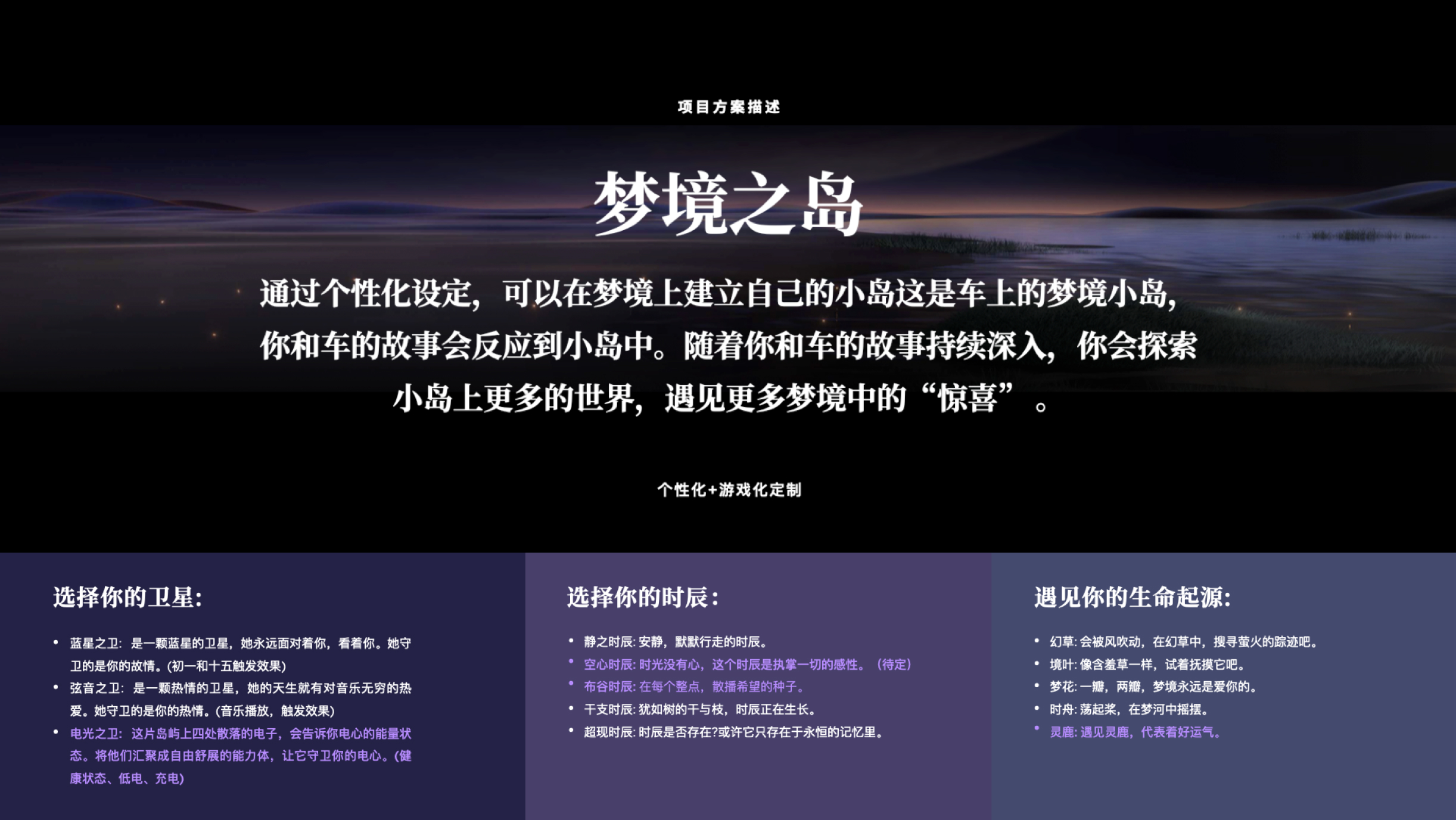 frog designed four animations, four customized typefaces and 2 Campaign (Launcher layouts). We add personalization to the IVI screen to create user's own unique island, where users and his story with the car will be reflected on the island. As the story continues, users will explore more of the island's world and encounter more "surprises" in the dream world.