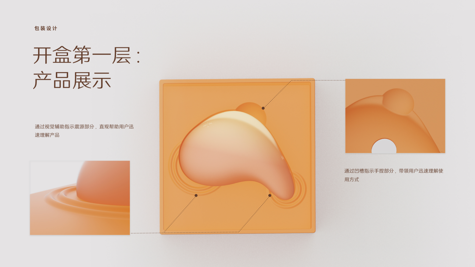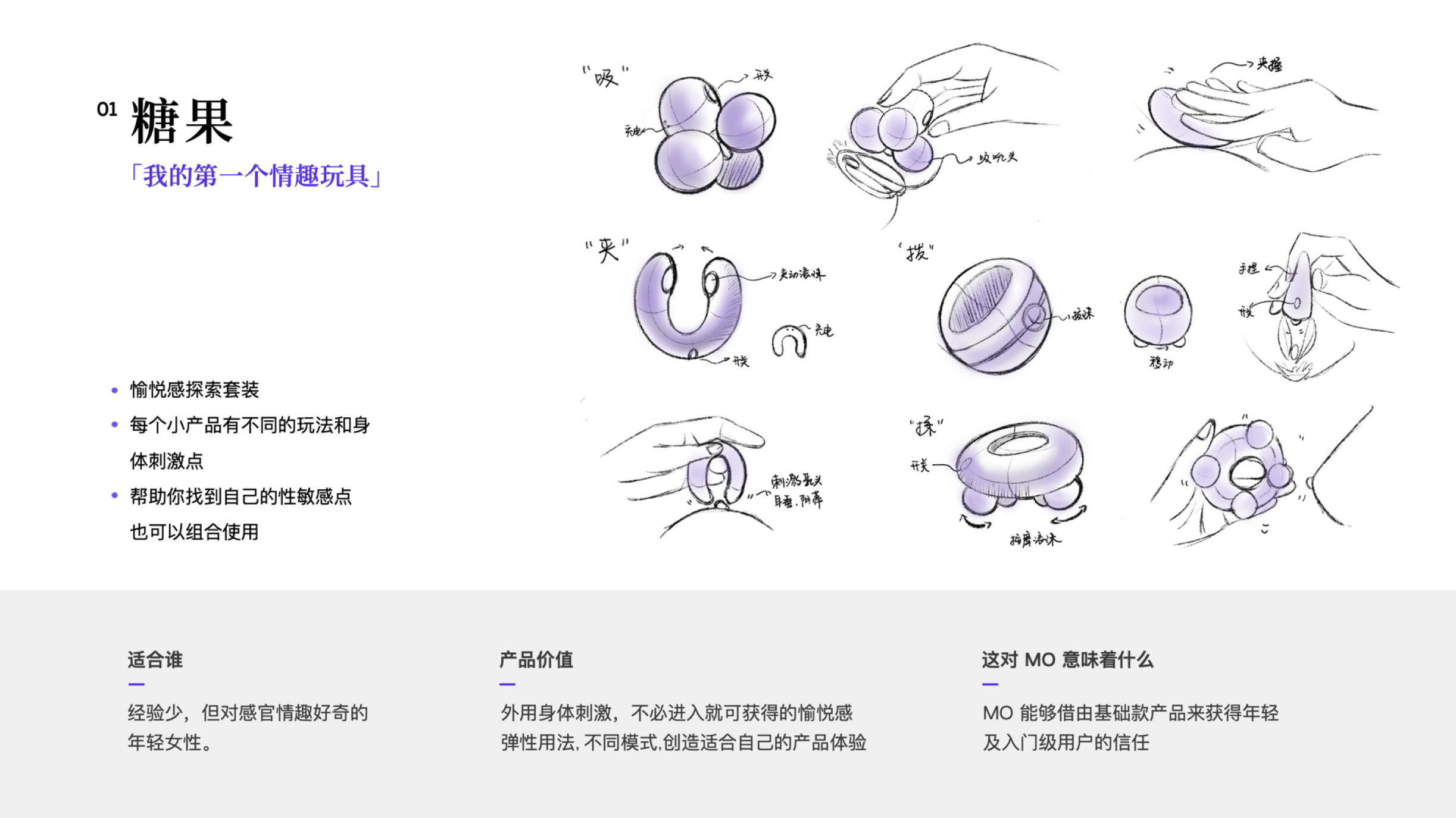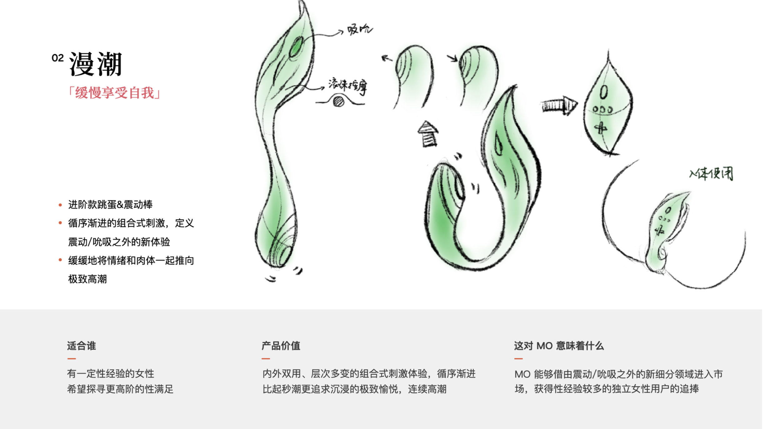 For women with different sexual experience, we respectively provide the overall product experience design with a set of 3 ’finger’ egg vibrators for entry level user and a ’slow sex’ vibrator for experienced user, so as to eliminate the psychological barriers of different consumers.